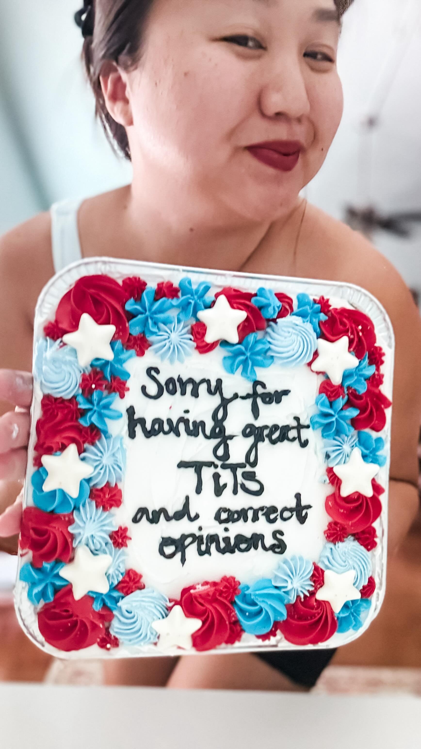Shiner Boch cake, buttercream frosting and crushed pretzels.